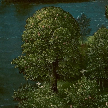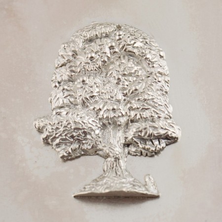 In Charon crossing the Styx (1520-1524), Joachim Patinir painted Charon sailing in his boat with a soul that must decide which path to take: the one that will lead him to salvation or the one that will lead him to damnation, hidden behind green meadows and fruit trees; one of which is reproduced in bas-relief on this elegant silver keyring, designed exclusively for the Museo del Prado.