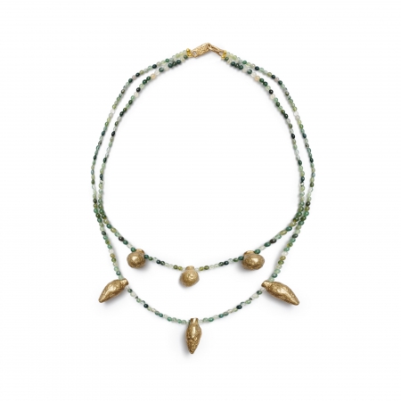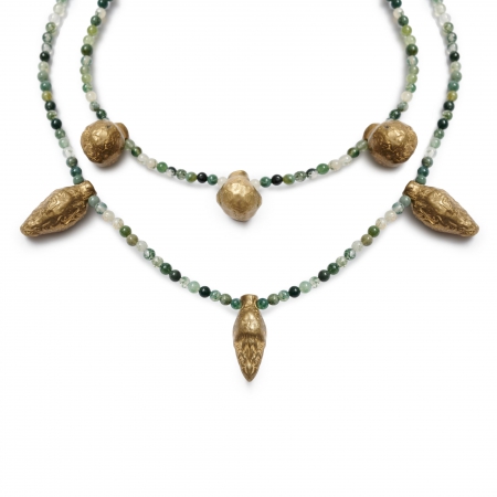 Amphorae, Olpai, Askoi and many objets that were the stars in the kitchen two thousand years ago come to live in this necklace that celebrates quotidian objets of ancient Rome, as can be seen in numerous paintings. Unique pieces handmade using the lost wax process and cast in bronze, a classic technique conserved throughout the years, and now, as then, allows creating effects highly expressive to celebrate the timeless beauty of the nature.