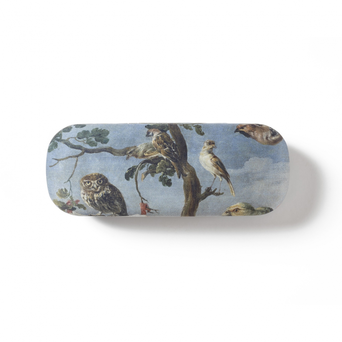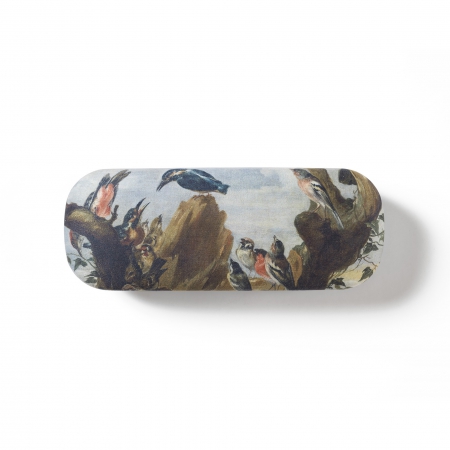 The representations of different birds perched on tree trunks as a Bird Concert, sometimes together with a musical score, were popularized by Flemish artists in the first decades of the 17th century, especially by Snyders. This glasses case reproduces a detail from a detail from Frans Snyders's work, Concert of Birds (1629-1630), which contains a great symbolism.