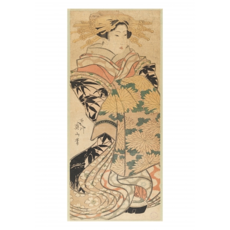 Produced using the technique of multiple coloured woodblock print popularly known as nishiki-e for its vivid polychrome effects, Courtesan of Yoshiwara (1820-1830) by Eizan Kikugawa is part of the Museo Nacional del Prado's collection of Japanese prints, acquired from the Nippon Hanga Kyokai (Society of Japanese Painters and Engravers) on the occasion of the Exhibition of Old and Modern Japanese Prints in May 1936 at the Museo Nacional de Arte Moderno in Madrid. A detail is reproduced in this fan, a traditional, effective and sustainable remedy to mitigate the summer heat.