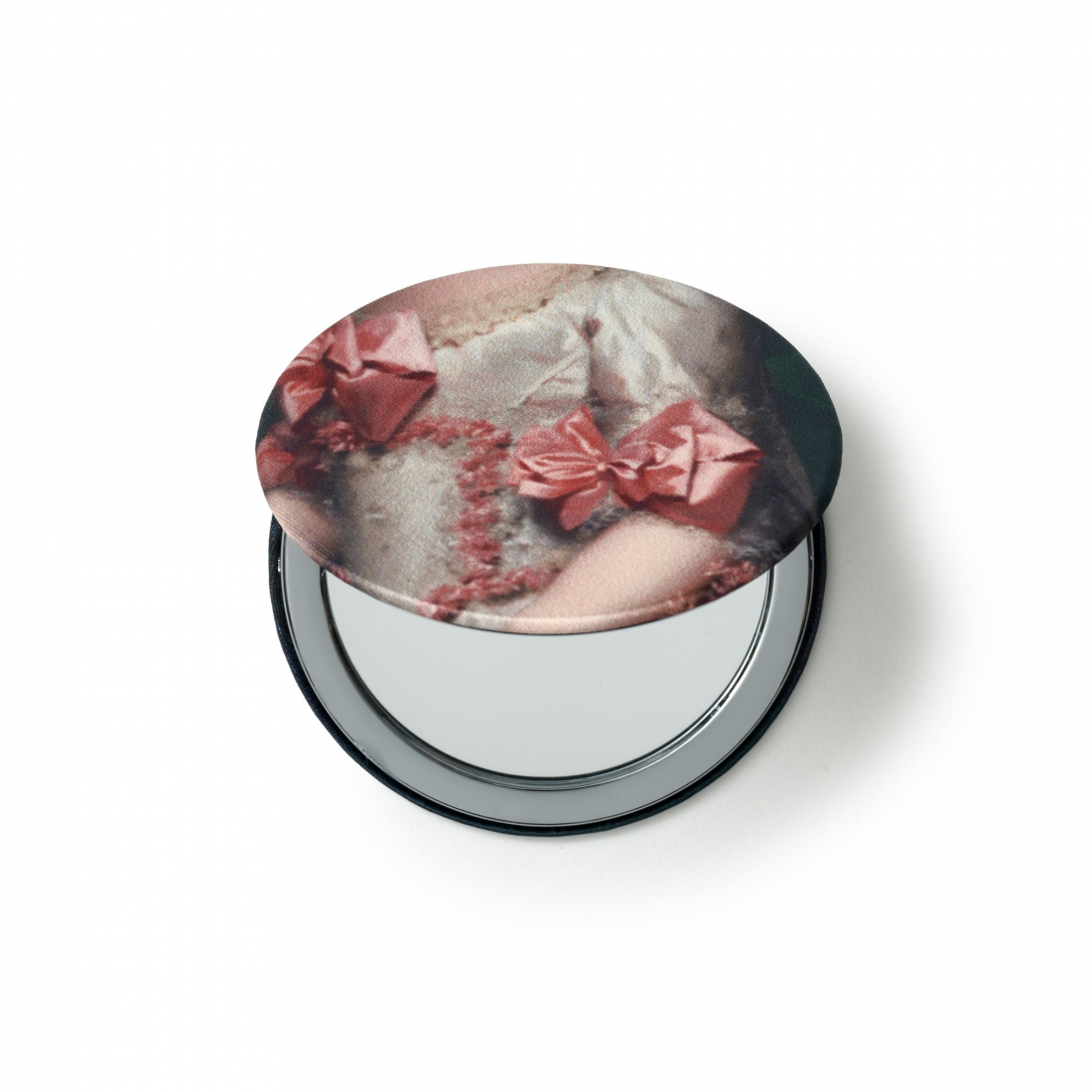 When Mengs arrived in Florence in early June 1770, he was given accommodation in the Palazzo Pitti and Charles III immediately commissioned him to paint portraits of the entire princely family. The result of this commission is the portrait of Archduchess Maria Theresa of Austria (1770), a detail of which is reproduced on the cover of this double mirror with lid. It shows the richness of the dress worn by the Archduchess in her childhood, adorned with pink bows and exquisite lace.