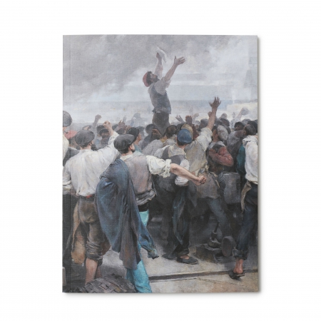 The limited possibilities of action that the working classes had throughout the 19th century expanded at the end of the century. Strikes became an instrument of defence and political struggle and, during the 1890s, they became more frequent in the more industrialised and mining areas, such as the outbreak of workers' strikes in Vizcaya and the celebration of May Day, where Vicente Cutanda y Toraya found the inspiration for a series of works of which this monumental canvas, Workers on Strike in Vizcaya (1892), forms part. The central detail of the composition is reproduced on this practical notebook with a textured cover.
