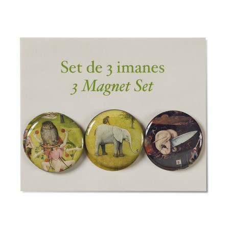 Animals and human forms abound in Bosch's The Garden of Earthly Delights Triptych (1490-1500), one of the essential paintings in the Museo del Prado collection. Three of the most representative ones (the monkey riding the elephant, the owl on a pair and the ears pierced by an arrow) are reproduced in this set of magnets, ideal for decorating your fridge or other metal surfaces.
