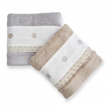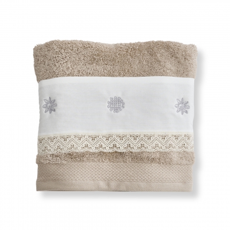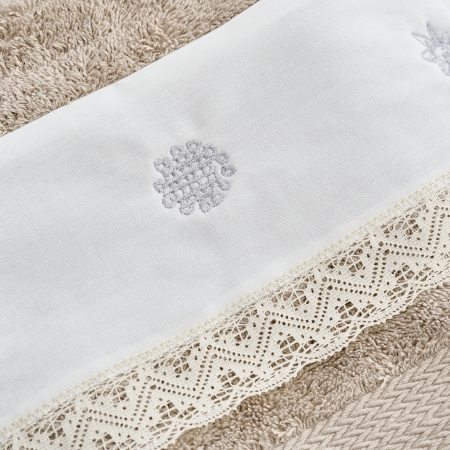 These towels have been embroidered in Spain by the Carmelitas Descalzas who live in the Convent of the Holy Trinity and the Virgin of Carmen in León, an order founded by Saint Teresa of Jesus in 1562. The motifs that adorn this garment are taken from The Virgin of the Sagrario in Toledo Cathedral (1750-1800), which belongs to the permanent collection of the Museo del Prado.