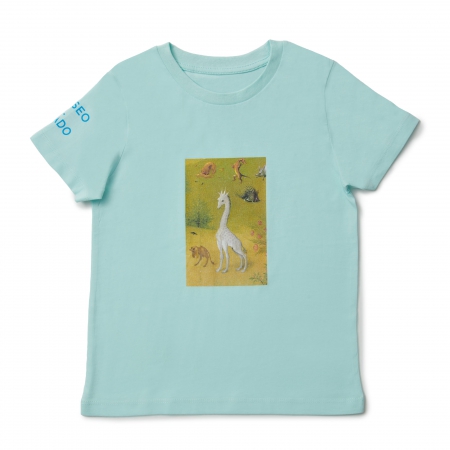 This beautiful blue children's T-shirt reproduces a scene from the central panel of the well-known Triptych of the Garden of Earthly Delights (1490-1500), a unique and enigmatic creation by Bosch, an essential work in the collections of the Prado Museum.