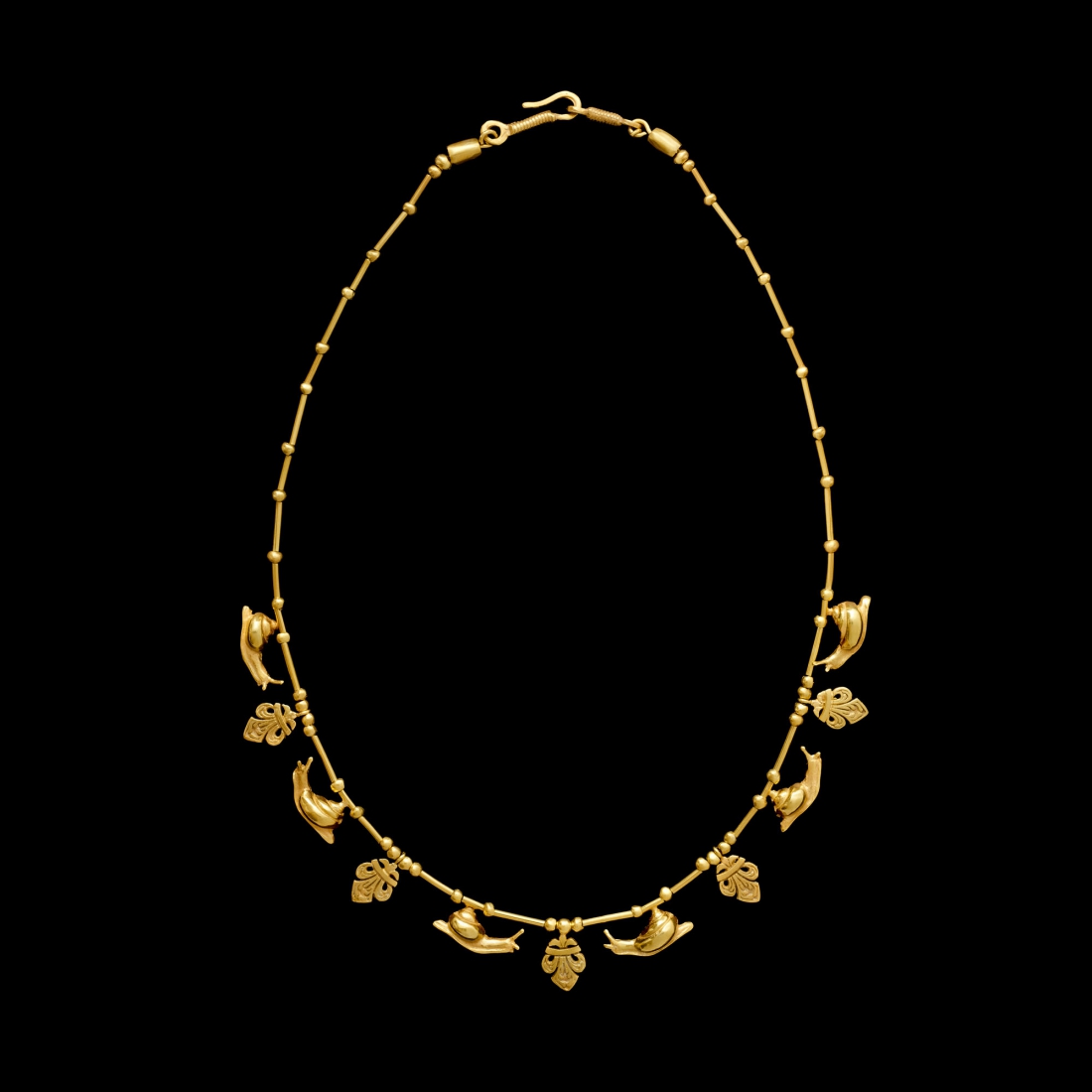 In this necklace the snail, the central element of the Shell-shaped jasper cup with a snail on the cover, is accompanied by the fleur-de-lis, evoking the harmony between nature and Baroque magnificence. The design recalls the splendor of cabinets of curiosities and the meticulous craftsmanship of the great European workshops of the 17th century.