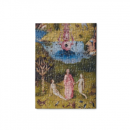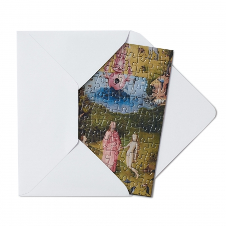 Find all the entertainment of a concentrated puzzle in this puzzle postcard that reproduces the panel of Paradise from the famous Garden of Earthly Delights Triptych (1490-1500), painted by Hieronymus Bosch.