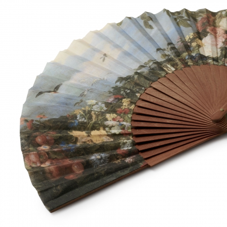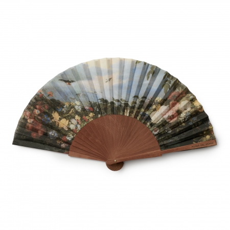 This beautiful fan reproduces a detail from The Virgin and Child in a Painting surrounded by Fruit and Flowers (1617-1620), the result of a collaboration between Jan Brueghel the Elder and Peter Paul Rubens. Its leaf is decorated with part of the exuberant garland in which these masters demonstrate an exquisite delicacy in the details of each element against the depth of an intensely blue sky.