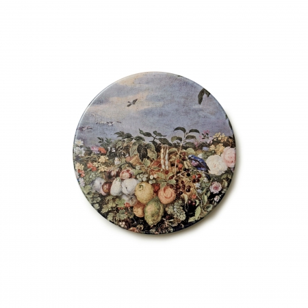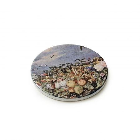 This ceramic coaster reproduces a detail from the work The Virgin and Child in a Painting surrounded by Fruit and Flowers (1617-1620), a collaboration between Jan Brueghel the Elder and Peter Paul Rubens. On its surface is shown a part of the exuberant garland where these masters demonstrate an exquisite delicacy in the details. Beauty and practicality come together in this product which, thanks to the strength and durability of ceramic, will be an essential accessory for your table.