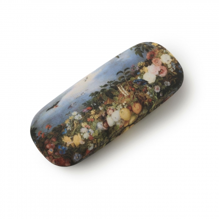 This practical case reproduces a detail from The Virgin and Child in a Painting surrounded by Fruit and Flowers (1617-1620), a collaboration between Jan Brueghel the Elder and Peter Paul Rubens. Decorated with part of the exuberant garland where these masters demonstrate an exquisite delicacy in the details of each element against the depth of an intense blue sky, its resistant and compact structure makes it ideal for carrying your glasses protected in your bag or backpack.