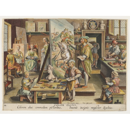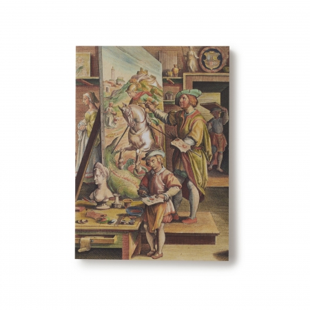 This compact notebook reproduces a detail from the print Color Olivi (circa 1591), engraved by Hans II Collaert, invented by Jan van der Straet and edited by Joannes Galle. This marvellous work is of great cultural and historical value as it shows life in an artist's studio in the 16th century, which is why it can be seen in the exhibition ‘Ruben's workshop’ which will be held at the Museo Nacional del Prado from 15 October 2024 to 16 February 2025. The aim of which is to show precisely what the ambience was like in which the artist produced his work.