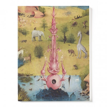 The Garden of Earthly Delights Triptych (1490-1500) is one of Bosch's most famous paintings and also one of the Museo del Prado's flagship works. The cover of this spine notebook depicts the Fountain of Life standing over a pond in the left panel of the triptych, which represents Paradise.