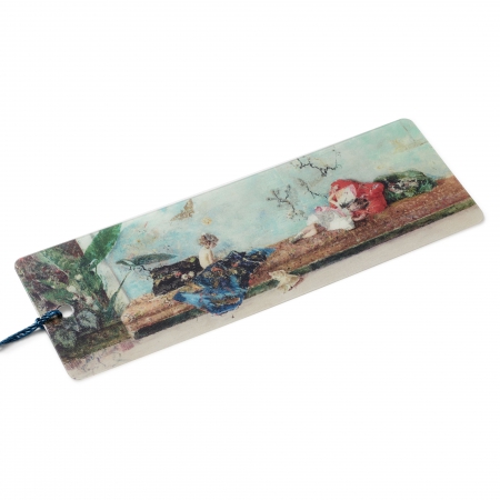 This original bookmark reproduces almost in its entirety the work The Painter's Children in the Japanese Room (1874). Mariano Fortuny captured the intimacy of his children in what was one of his most captivating works. Thanks to its 3D effect, you will be captivated by the movement of the butterflies on the fascinating green background, just as little María Luisa does as she fans herself while lying down.