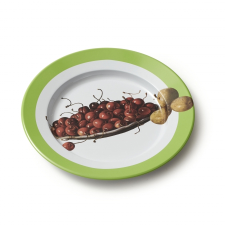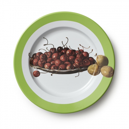 A detail from the work Still Life with a Plate of Cherries, Plums a Pitcher and Cheese (circa 1760), by Luis Egidio Meléndez, is reproduced in this beautiful plate.