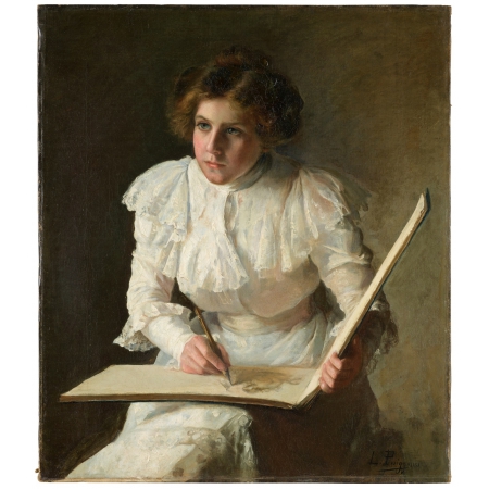 María Luisa Puiggener was one of the most outstanding painters of the late 19th and early 20th centuries in Andalusia and one of the most important in Spain, portraying the social reality of the time through portraits of women. In the canvas An Artist (circa 1901) the iconography reflects a demand for a serious and professional valuation of the training and work of women creators. Thus, the figure in the composition is not a gentle representation of a girl engaged in a pastime, but of a studious woman concentrating on an act of study, examining the model and making her drawing.