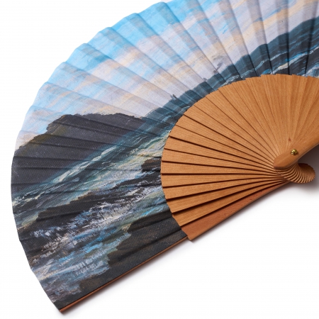 La naturaleza agreste de la costa cantábrica fue captada por uno de los paisajistas con mayor renombre en las colecciones del Museo Nacional del Prado, Carlos de Haes, en obras como Acantilados (Guéthary) (h. 1881), reproducida en este abanico, remedio tradicional, efectivo y sostenible para mitigar el calor veraniego.