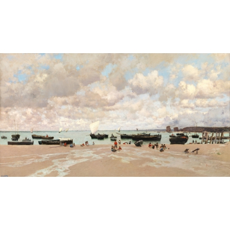 En este abanico, remedio tradicional, efectivo y sostenible para mitigar el calor veraniego, se reproduce un detalle de Desembocadura del Bidasoa (1872), una de las pinturas de mayor calidad de Martín Rico y Ortega. Despojada de todo elemento, la arena fangosa aparece pintada en finos tonos malvas, sobre los que destacan los cuidados verdes claros, con algún reflejo rosa, de los charcos que deja la bajamar.
