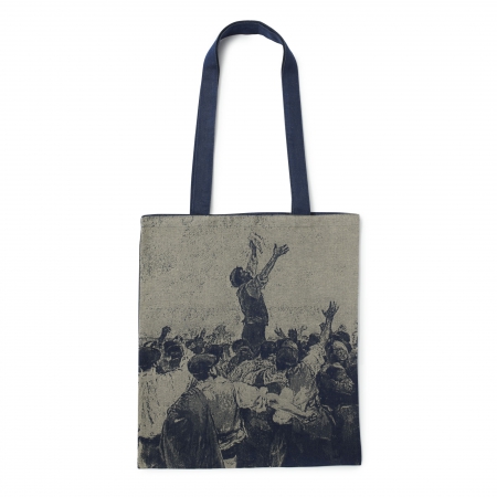 Las limitadas posibilidades de acción que tuvieron las clases trabajadoras a lo largo del siglo XIX se ampliaron a final de la centuria. Las huelgas se convirtieron en un instrumento de defensa y de lucha política y, durante la década de 1890, se hicieron más frecuentes en las zonas más industrializadas y mineras, como por ejemplo el estallido de huelgas obreras que hubo en Vizcaya y la celebración del Primero de Mayo, donde Vicente Cutanda y Toraya encontró la inspiración para una serie de obras de las que forma parte este monumental lienzo, Una huelga de obreros en Vizcaya (1892). Se reproduce en detalle la figura principal de la composición tejida en telar que hace de esta bolsa un complemento muy especial.