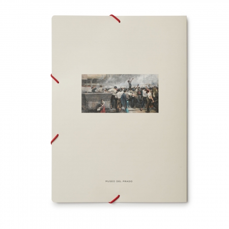 Las limitadas posibilidades de acción que tuvieron las clases trabajadoras a lo largo del siglo XIX se ampliaron a final de la centuria. Las huelgas se convirtieron en un instrumento de defensa y de lucha política y, durante la década de 1890, se hicieron más frecuentes en las zonas más industrializadas y mineras, como por ejemplo el estallido de huelgas obreras que hubo en Vizcaya y la celebración del Primero de Mayo, donde Vicente Cutanda y Toraya encontró la inspiración para una serie de obras de las que forma parte este monumental lienzo, Una huelga de obreros en Vizcaya (1892). Se reproduce el detalle central de la composición en la portada de esta práctica carpeta donde podrás archivar varios documentos en formato A4.