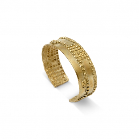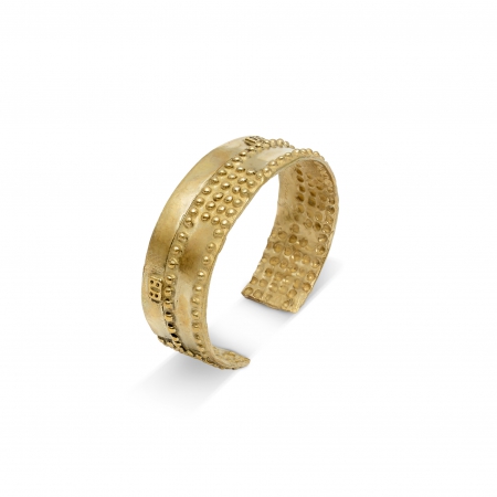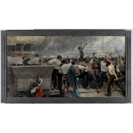 El arte de finales del siglo XIX representó un nuevo tipo de geometría inspirado por las fábricas y las industrias. Algunos marcos de esa época complementaban la iconografía de la obra enmarcada, como el espectacular marco en el que se inspira el diseño de estas pulseras: la moldura de la obra Una huelga de obreros en Vizcaya (Vicente Cutanda y Toraya, 1892), que imitaba, en madera, planchas de hierro roblonado.