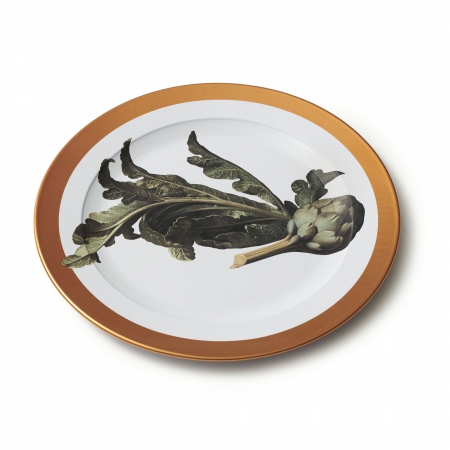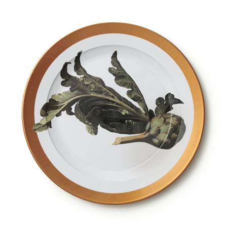 En este bonito plato se reproduce un detalle de la obra Bodegón con alcachofas, flores y recipientes de vidrio (1627), de Juan van der Hamen y León.