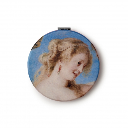 Este espejo de bolsillo reproduce un detalle de la obra Las tres Gracias (1630-1635), de Pedro Pablo Rubens. En su superficie se muestra el rostro de una de las diosas que se ha tendido a identificar con Helena Fourment, segunda esposadel pintor. La mirada que dedica a sus compañeras evidencia la atmósfera que envuelve la obra, convirtiéndola en una de sus pinturas más excepcionales e íntima. El maravilloso detalle se captura en este producto que, gracias a su tapa y su doble espejo de aumento, se convertirá en el accesorio fundamental para llevar siempre contigo en el día a día.