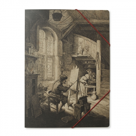 Esta práctica carpeta reproduce un detalle de la estampa El pintor en su taller (hacia 1667), editada y grabada por Adriaen van Ostade. Esta obra es de un gran valor cultural e histórico puesto que nos permite conocer cómo era el taller de un artista en el siglo XVII, motivo por el que se podrá contemplar en la exposición "El taller de Rubens" que tendrá lugar en el Museo Nacional del Prado desde el 15 de octubre de 2024 hasta el 16 de febrero de 2025, cuyo objetivo es dar a conocer precisamente el ambiente donde el artista desarrollaba su obra.