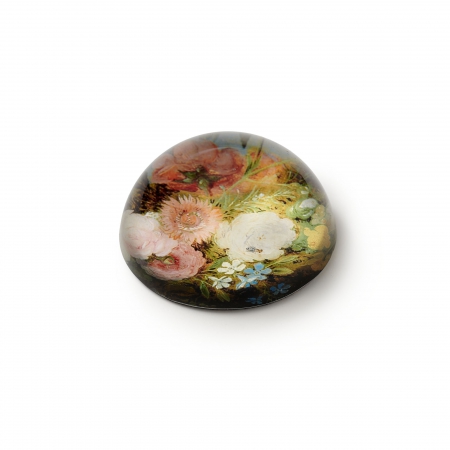 Este bonito pisapapeles de cristal reproduce un detalle de la obra La Virgen y el Niño en un cuadro rodeado de flores y frutas (1617-1620), resultante de la colaboración de Jan Brueghel el Viejo y Pedro Pablo Rubens. Muestra parte de la exuberante guirnalda donde estos maestros demuestran una delicadeza exquisita en los detalles. Este producto no solo mantiene tus documentos en orden, sino que también aporta un toque elegante a tu escritorio.