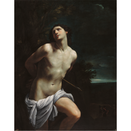 Tras conocer la pintura del que entonces era el artista más radical y rompedor activo en Roma, Caravaggio, Guido Reni modificó su propio estilo, intentando superarle mediante la imitación de su quehacer. Aunque pronto siguió su camino, fue un peldaño más en la forja de su propia identidad. Un ejemplo de esta etapa es San Sebastián (1617-1619), obra que formó parte de la colección de Isabel de Farnesio y ha pasado por diferentes palacios hasta llegar a la colección del Museo del Prado, donde hace un precioso trabajo de claroscuro que bien se puede apreciar en el detalle se reproduce en la superficie de este salvamantel.