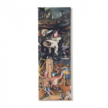 El formato alargado de los paneles laterales del Tríptico del jardín de las delicias (1490-1500), del Bosco, se acentúa en este imán panorámico, que reproduce la parte central de la tabla dedicada al Infierno.