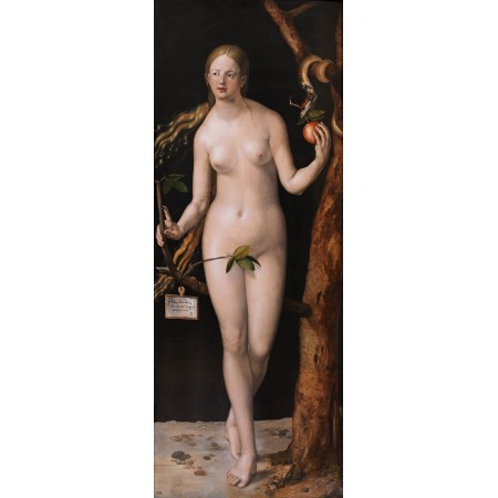 En un intento por sintetizar su tradición germánica con las nuevas enseñanzas italianas aprendidas, Durero trata de alcanzar la perfección ideal del cuerpo humano pintando dos tablas que forma un conjunto Adán y Eva. En este imán, se reproduce un detalle del exquisito cuadro Eva (1507).