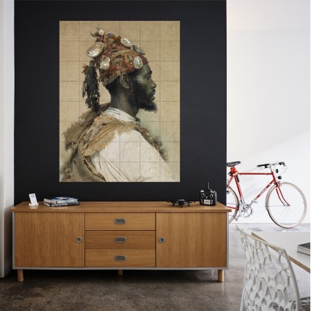 Decora tus paredes con una exclusiva decoración mural IXXI, integrada por varias piezas que se ensamblan fácilmente mediante un sencillo sistema de anclaje. Este modelo reproduce fielmente la obra Parache, el bailador (José Tapiró y Baró, 1895-1900), que representa el busto de perfil de un gnawi originario de Marrakech.