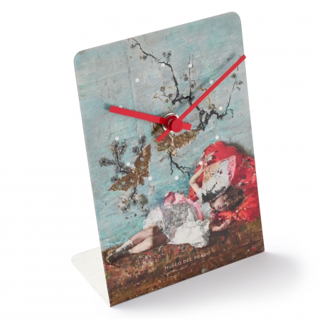 En la superficie de este bonito reloj se reproduce un detalle de la obra que causó fascinación desde el mismo momento de su ejecución: Los hijos del pintor en el salón japonés (1874), que Mariano Fortuny dejó inacabada a su muerte. El fragmento nos muestra a María Luisa, la hija mayor del pintor, donde se aprecia el contraste que existe entre las manchas fluidas presentes en buena parte de la obra, que alcanzan gran belleza en el abanico de la niña.