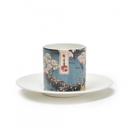 La rica policromía conseguida gracias a la técnica de múltiple impresión de tacos de madera a color conocida popularmente como nishiki-e, da vida a la obra Fiesta de contemplación de los cerezos en flor en Asukayama (Asukayama hanami) (1830-1843), de Utagawa Hiroshige y Sanoya Kihei (editor). Una pieza especial que se conserva en la colección de estampas japonesas del Museo Nacional del Prado, y que decora este delicado y sofisticad set de expreso.
