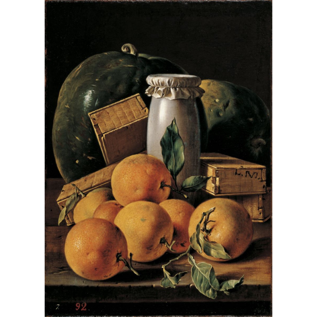 Bodegón con naranjas, sandías, melero y cajas de dulces