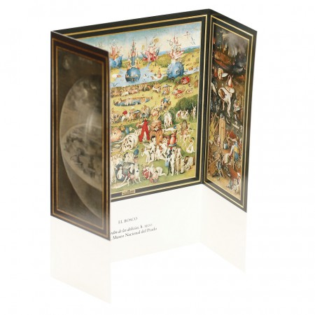 Postal plegable que reproduce el tríptico El Jardín de las Delicias (El Bosco, h. 1500), abierto y cerrado.