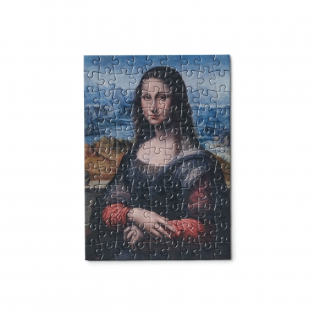 Encuentra todo el entretenimiento de un rompecabezas concentrado en esta postal puzzle que reproduce el cuadro Mona Lisa (1507-1516), del taller de Leonardo Da Vinci.