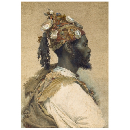 El busto de perfil de un gnawi originario de Marrakech, de la obra de José Tapiró, Parache, el bailador (1895-1900), se reproduce en este original poster metálico. Su moderno diseño extra plano y su acabado mate hacen de él una pieza de decoración única que te permitirá tener un pedacito de las colecciones del Museo Nacional del Prado en tu propia casa.