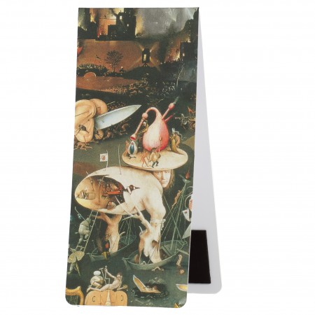 El motivo del hombre-árbol fue pintado por el Bosco en varias ocasiones, entre ellas, en el panel derecho del Tríptico del jardín de las delicias (1490-1500), una figuración del Infierno que se reproduce parcialmente en este práctico marcapáginas magnético, con el que podrás señalar el lugar donde interrumpiste la lectura de tus libros favoritos.