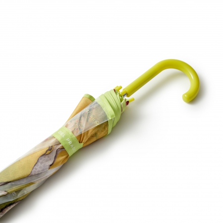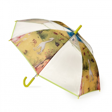 Paraguas infantil con puño curvo que reproduce en cuatro de sus gajos una escena del panel central del archiconocido Tríptico del jardín de las delicias (1490-1500), creación única y enigmática del Bosco, una obra imprescindible en las colecciones del Museo del Prado.