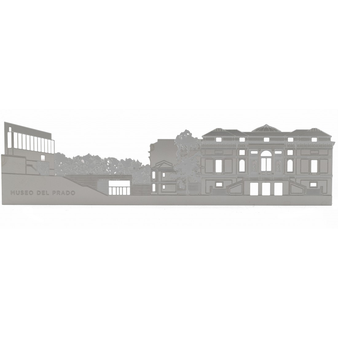 El alzado norte del Prado reproducido en este minimalista marcapáginas metálico es una de las vistas más características del Museo, con el edificio histórico proyectado por Juan de Villanueva a la derecha y la ampliación diseñada por Rafael Moneo a la izquierda unidos a través de la entrada de los Jerónimos.