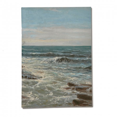 Rocas bañadas por la espuma del mar producida por la rompiente de olas que se ve detrás: este cuaderno reproduce la obra Acantilados (Guéthary) (h.1881) de uno de los paisajistas con mayor renombre en las colecciones del Museo Nacional del Prado, Carlos de Haes.