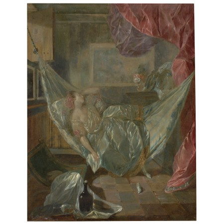 Un elegante y sofisticado cortinaje enmarca esta pequeña escena en la que una joven sueña plácidamente en una atmósfera llena de ricos detalles. La pequeña pintura denominada Joven durmiendo en una hamaca (Luis Paret y Alcázar, 1775-1778) queda reproducida casi completa en esta práctica carpeta de un compartimento con capacidad para guardar documentos de tamaño A4.