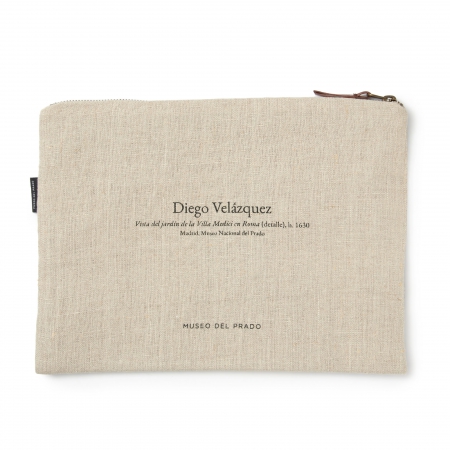 Este neceser de lino reproduce un detalle de Vista del jardín de la Villa Medici en Roma (hacia 1630), de Diego Velázquez. Dos son los factores que singularizan esta obra en relación al contexto de la pintura de su tiempo, además de su altísima calidad. En primer lugar, la ausencia de tema, y en segundo, la rareza de que el pintor se plantara con sus útiles de pintar delante del motivo y atacara directamente el lienzo, como hizo el pintor sevillano en este caso.