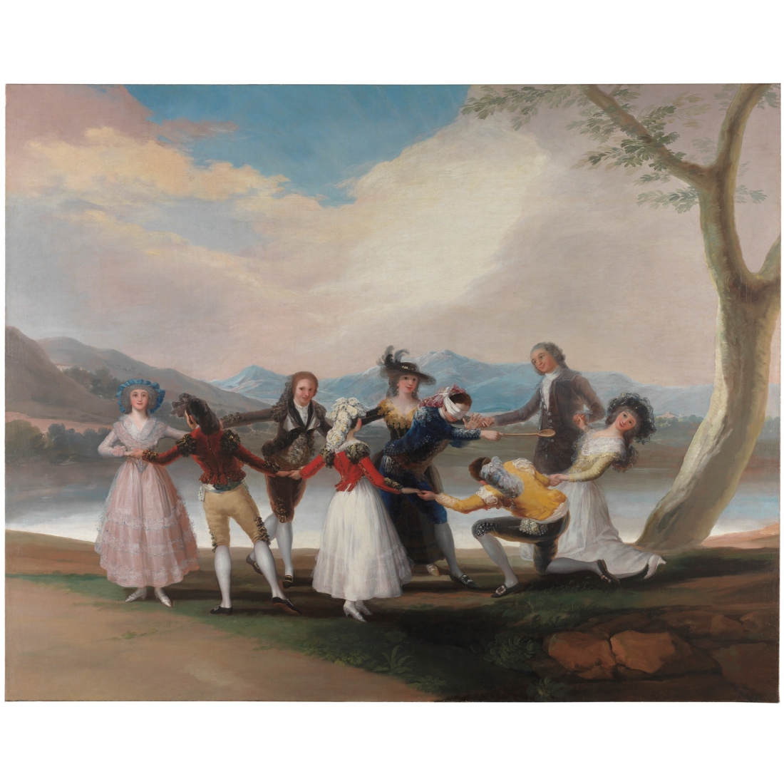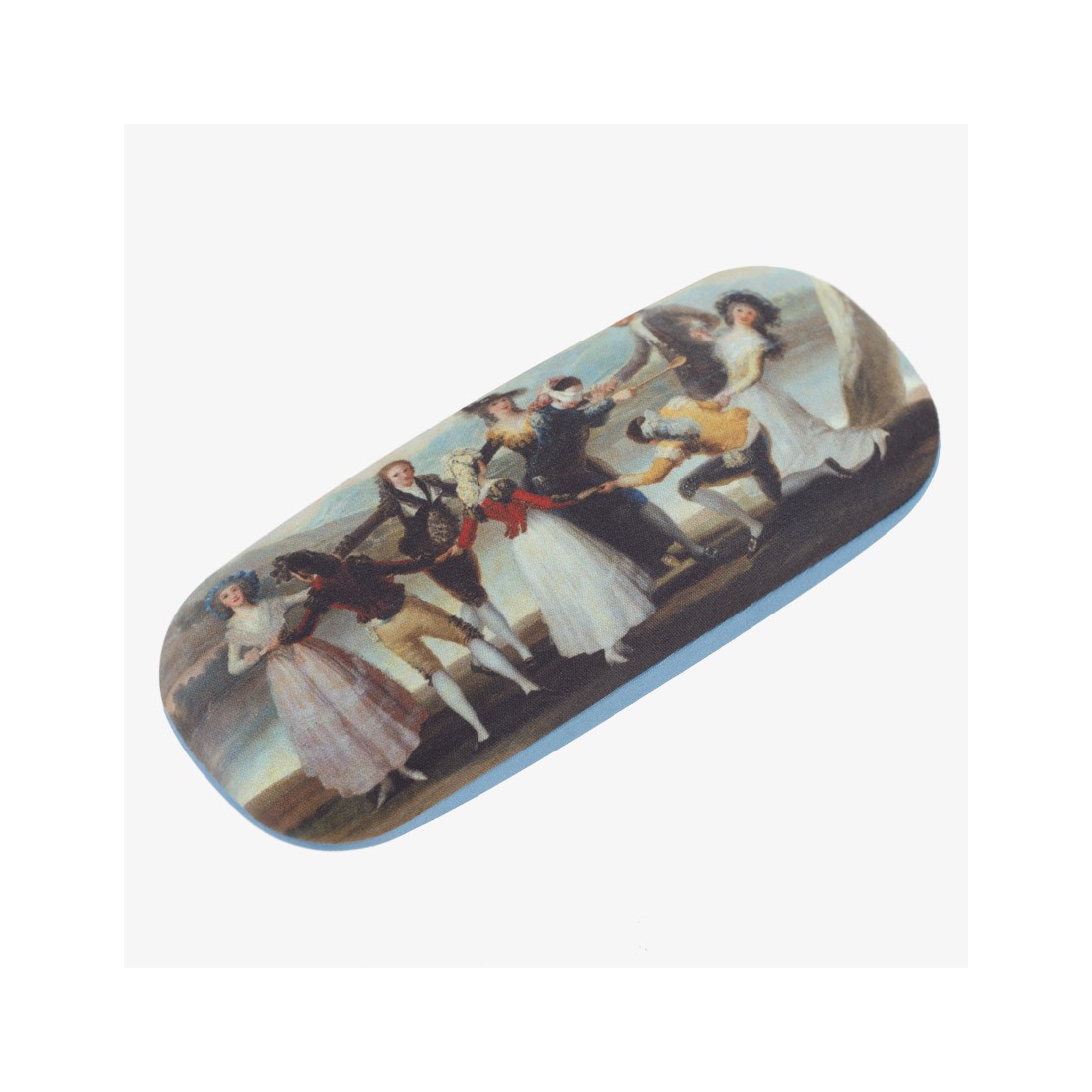 En el centro de un corro de personajes caracterizados por su indumentaria tradicional uno de los jóvenes, con los ojos vendados, intenta alcanzar a sus compañeros con una cuchara, según las reglas del juego popular. Este estuche, que reproduce un detalle de uno de los cartones para tapices del Museo Nacional del Prado en los que Goya recreó escenas de la vida cotidiana del Madrid de finales del siglo XVIII, La gallina ciega (1788), protegerá tus gafas para poder llevarlas contigo a cualquier parte.