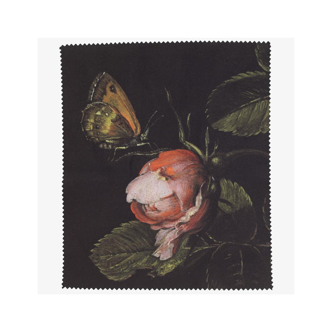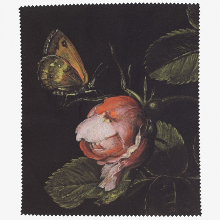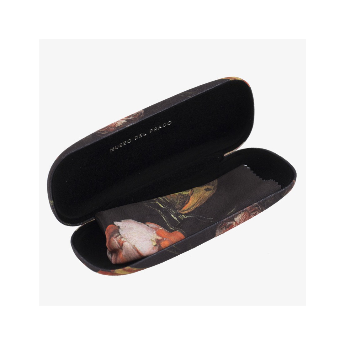 El brillo conseguido a través del color hace que las flores destaquen delicadamente sobre el fondo oscuro en este elegante estuche de gafas, que reproduce en detalle alguna de las flores que se retratan en la obra del Museo Nacional del Prado, Florero (siglo XVII), de Jan Brueghel, el Viejo.