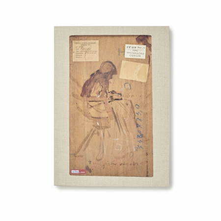 Con motivo de la exposición Reversos, celebrada en el Museo Nacional del Prado del 7 de noviembre de 2023 al 3 de marzo del 2024, se presenta al público la magnífica obra que se reproduce en este bonito cuaderno: Apunte de muchacha sentada leyendo (h. 1884), de Vicente Palmaroli, procedente del Museo de Jaén, donde se alberga como depósito del Museo Nacional del Prado. Esta obra es de gran interés puesto que se trata del reverso de Paisaje. Para muchos artistas del siglo XIX era habitual tomar notas pictóricas, sobre todo de paisaje, aunque en este caso ambas caras se han tratado como reversos, pudiéndose apreciar etiquetados de inventario en ambos lados.