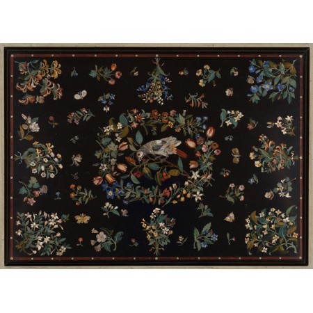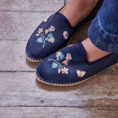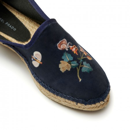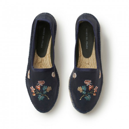 Los regalos diplomáticos eran frecuentes en la Edad Moderna, como atestigua el Bufete del Nuncio Massimo (1624), obsequiado por este eclesiástico a Felipe IV. Labrado en las más excepcionales piedras duras de las manufacturas florentinas, se hace eco del cambio de gusto de la época, que favoreció la decoración naturalista con elementos florales como los reproducidos en este original par de alpargatas elaboradas y cosidas a mano en un suave tejido azul de terciopelo.