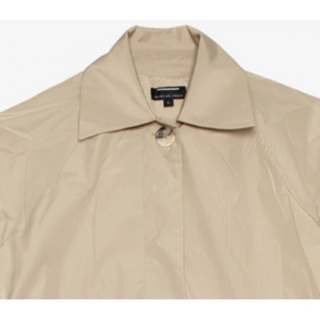 Esta atemporal gabardina de un elegante color beis está confeccionada con un tejido impermeable y ligero, gracias a lo cual se puede doblar fácilmente y guardar en la bolsita de tela que la acompaña, haciendo de ella un complemento ideal para viajar.