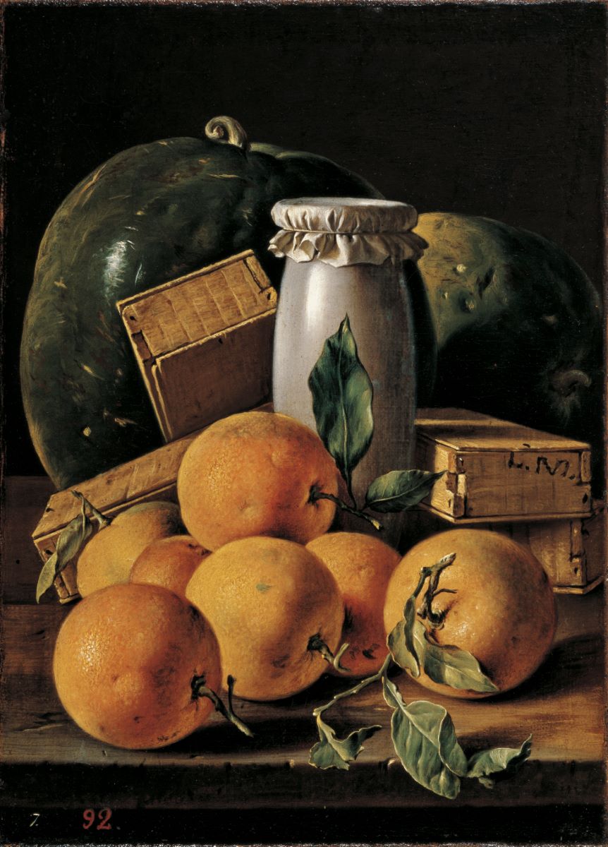 Bodegón con naranjas, sandías, melero y cajas de dulces